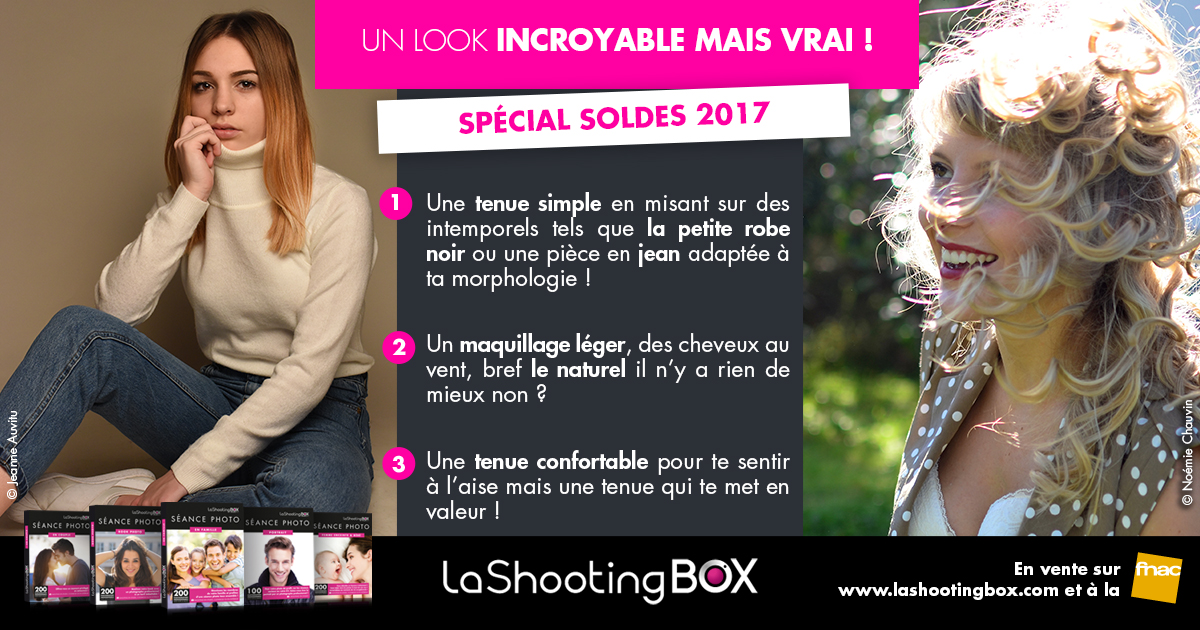 Alors êtes-vous enfin prêtes pour réaliser votre shooting photo ? Plus besoin de passer des heures devant l’armoire ! Prêt, feu, partez… en route pour votre shooting photo et n’oubliez pas que vous bénéficiez de –25% avec notre code promo SOLDES2017 !